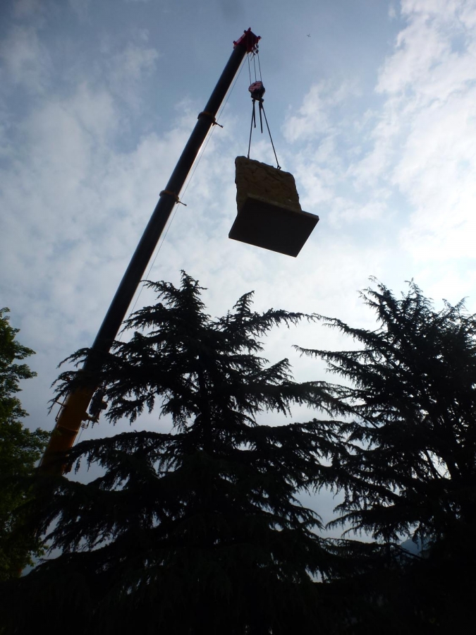 Die 10 Tonnen schweren Elemente wurden mit einem Sattelschlepper angeliefert und per Pneukran über die hohen Bäume auf die kundenseitig vorbereiteten Fundamente gesetzt.
