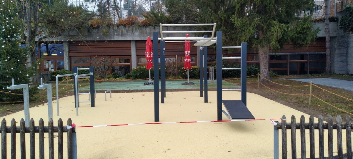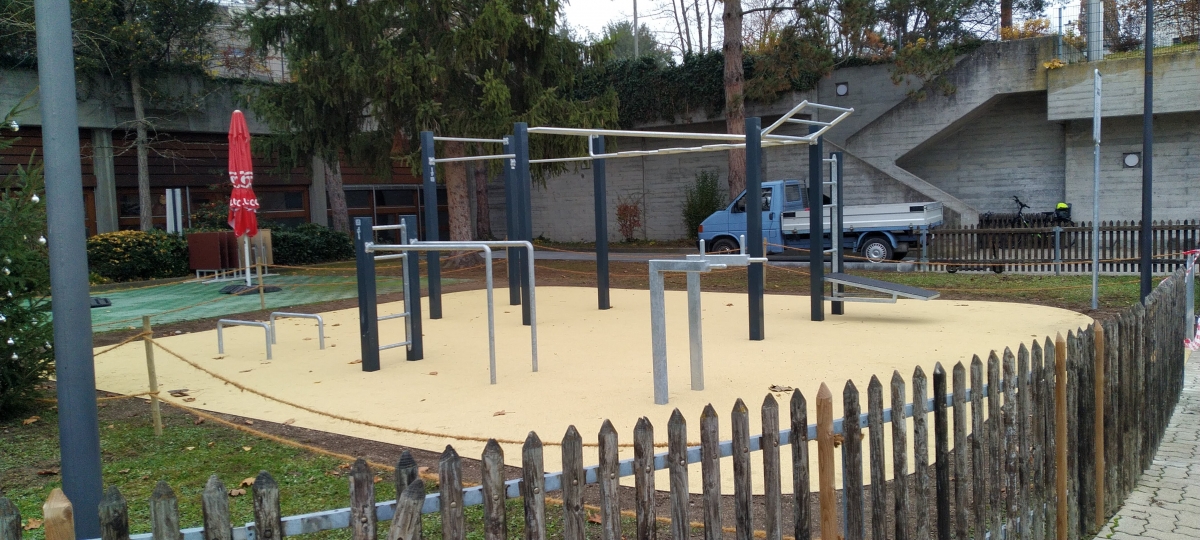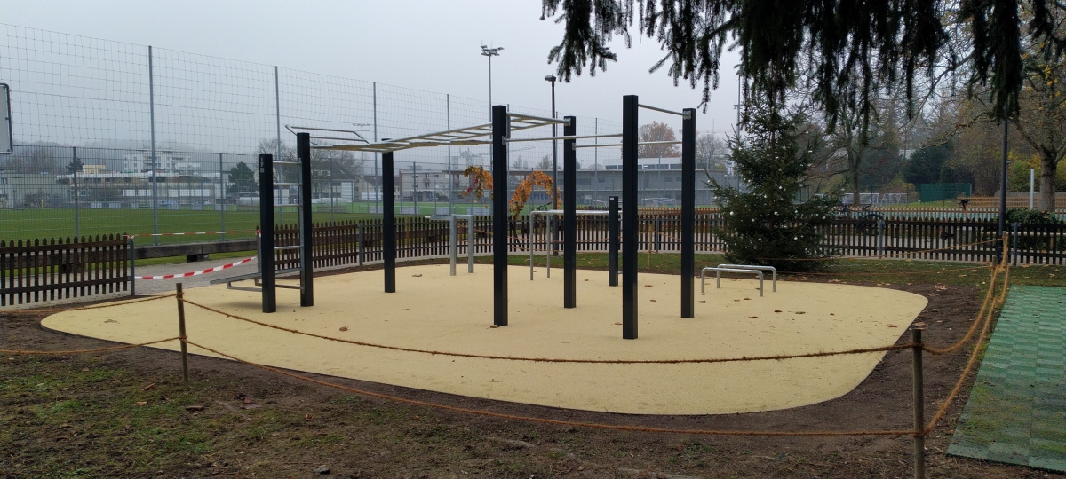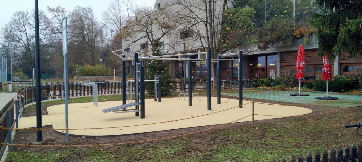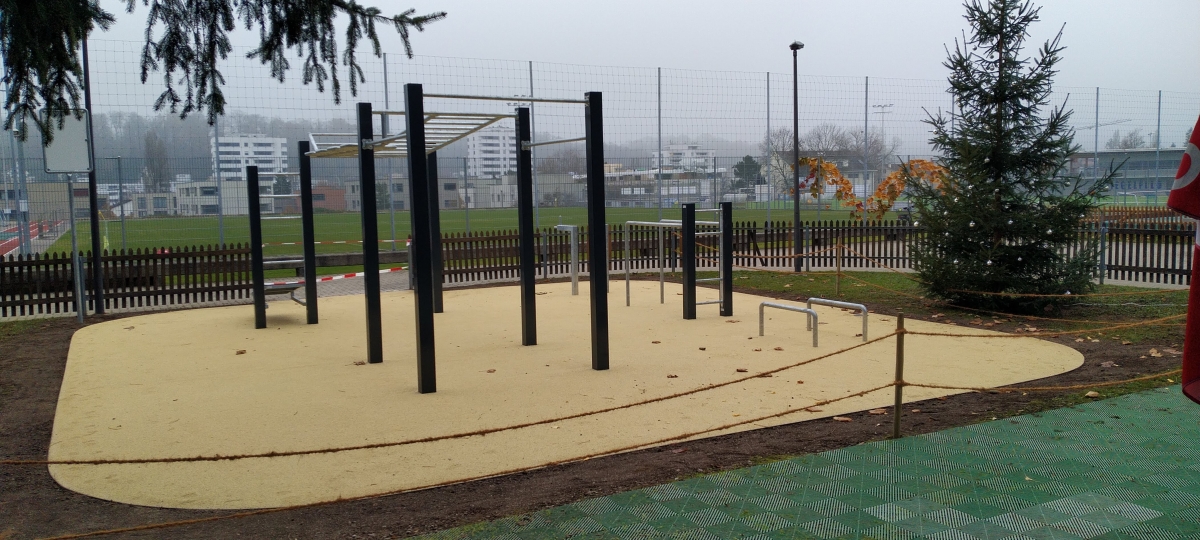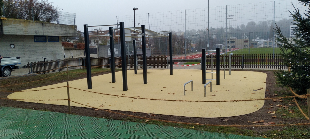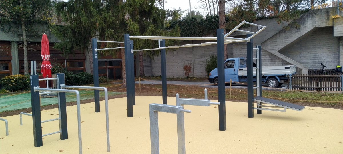 Bei der Sporthalle Spiegelfeld an der Wassergrabenstrasse 21 in Binningen hat Vertical Technik AG eine neue Street Workout Anlage installiert. Sie beinhaltet Bench, Highbars, Reckstangen, Monkey Bars, Snake Bar und Beinheber.
