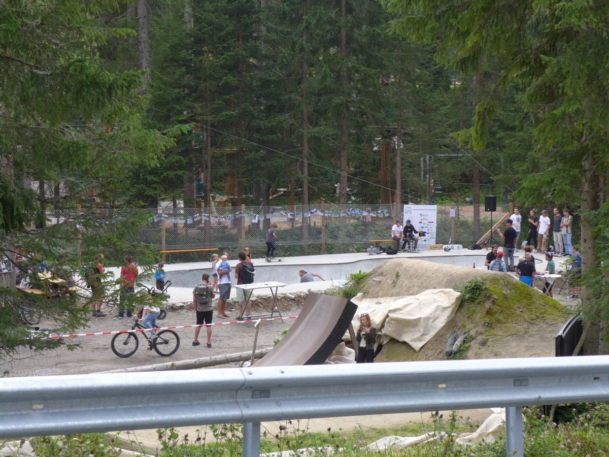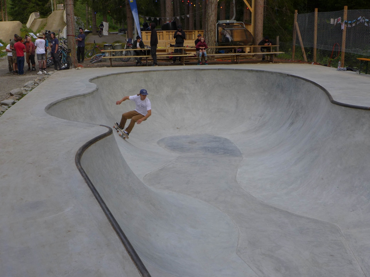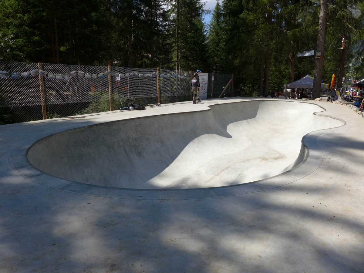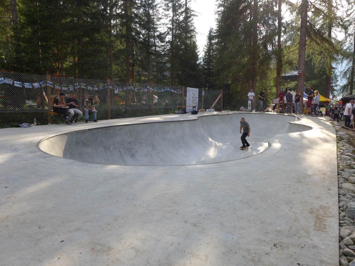 Mit 1588 Meter über Meer ist dies die in Europa höchst gelegene von Vertical gebaute Bowl! Sie hat eine Tiefe von 1.3 bis zu 2 Metern mit 10 cm Vert. Im Shallow End, dem weniger tiefen Teil, wurde ein Stahl Coping und im Deep End ein Beton Pool Coping verbaut. Dies gibt Abwechslung und fordert die Skills der Fahrer.