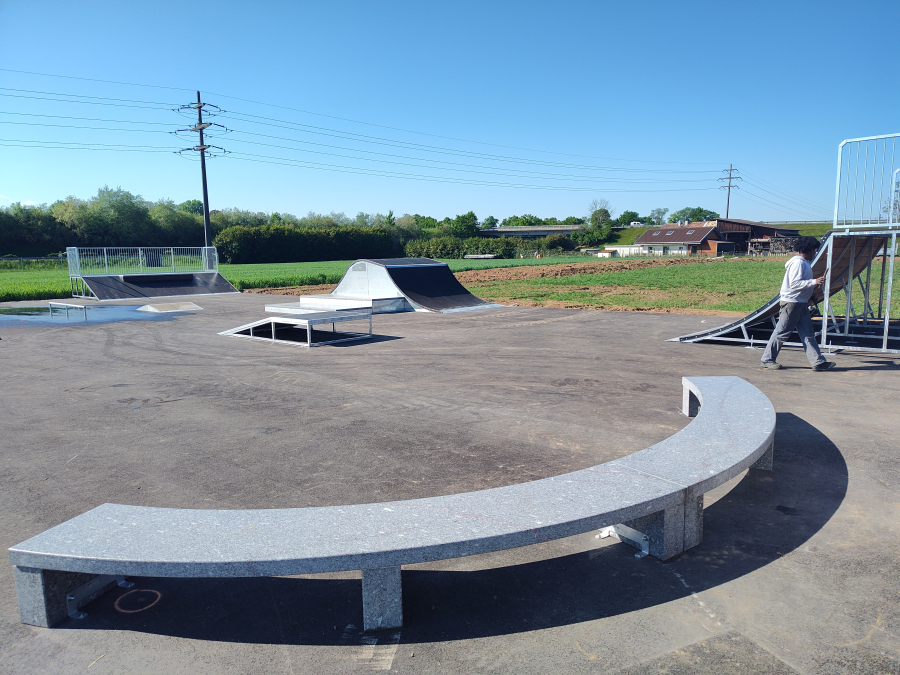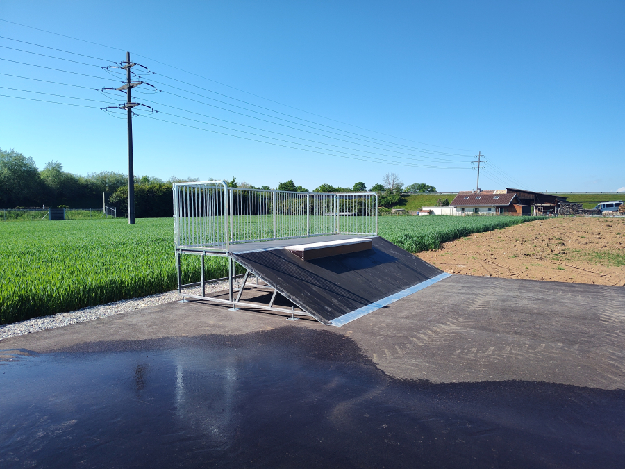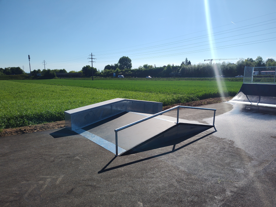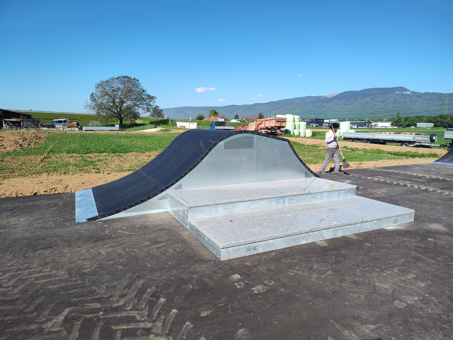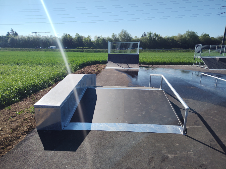 Dieses Top-Setup kostete wenig Geld im Vergleich zu einem Beton Skatepark. Der neue Skatepark ist eine großartige Ergänzung für Duillier VD und lädt Skater sowie Scooterfahrer ein, im Grünen und in entspannter Atmosphäre ihre Tricks zu perfektionieren.