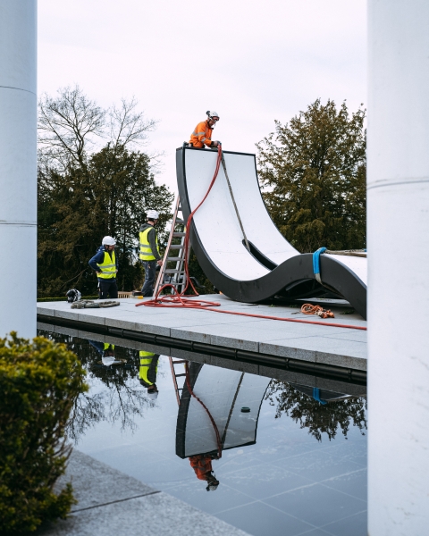 Vertical Technik AG hat die Skulptur in Form des Grossbuchstabens „A“ mit einer Welle und einer senkrechten Wand gebaut und installiert.