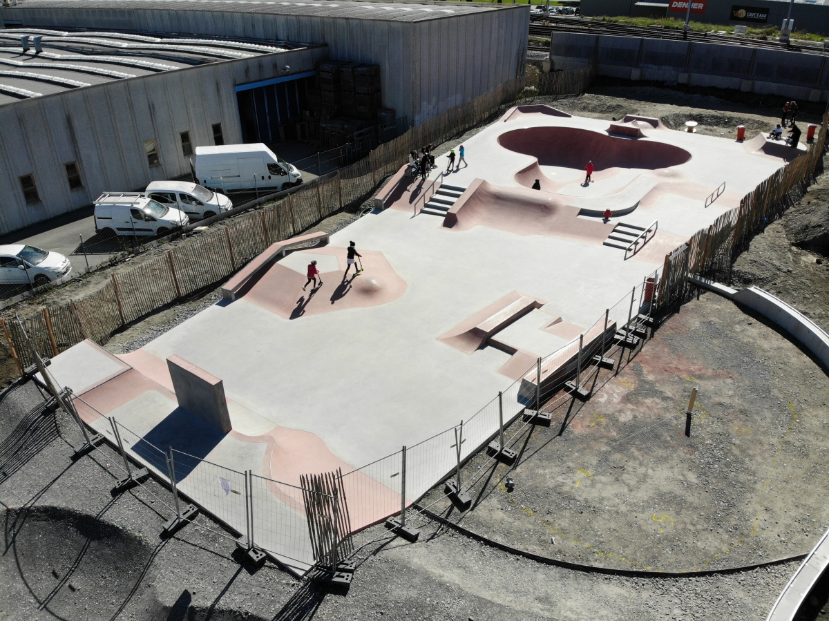 Als Skatepark mit Street, Bowl und Flowpark deckt er alle Niveauklassen ab. Fotografiert eine Drohne den Betonskatepark von oben, wirkt die 774 m2 Betonlandschaft geradezu einladend und schön eingebettet in den Freizeitpark neben dem Jugendhaus. Der Street Bereich bietet einen Wallride, Treppen, Handrails, Hubbas und eine Pyramide. Daneben liegt eine Clover Bowl mit Roll-In und Box für Fly-outs. Die Plattform ist bestückt mit einer Taco mit Slappy Curbs und einer Pyramide. Direkt am Coping der Bowl steht ein kreatives Objekt, bestehend aus einer Mischung zwischen Spine und Wobble.