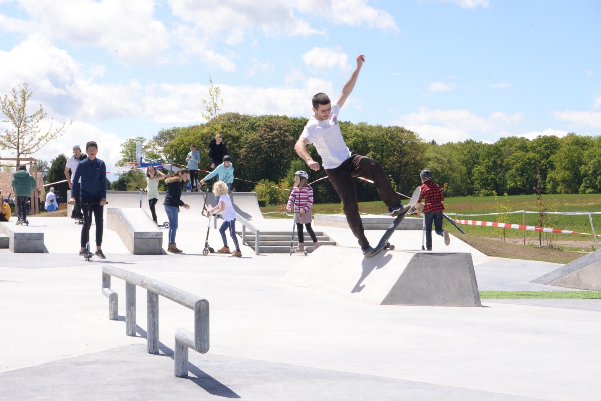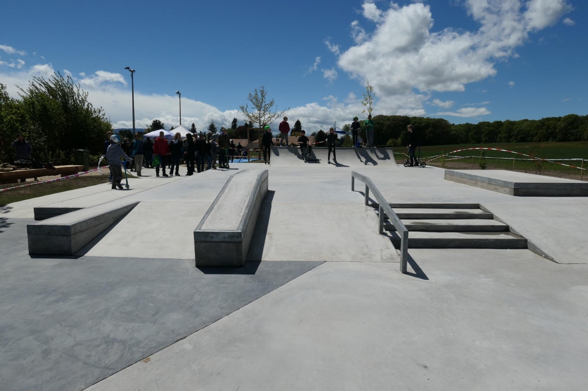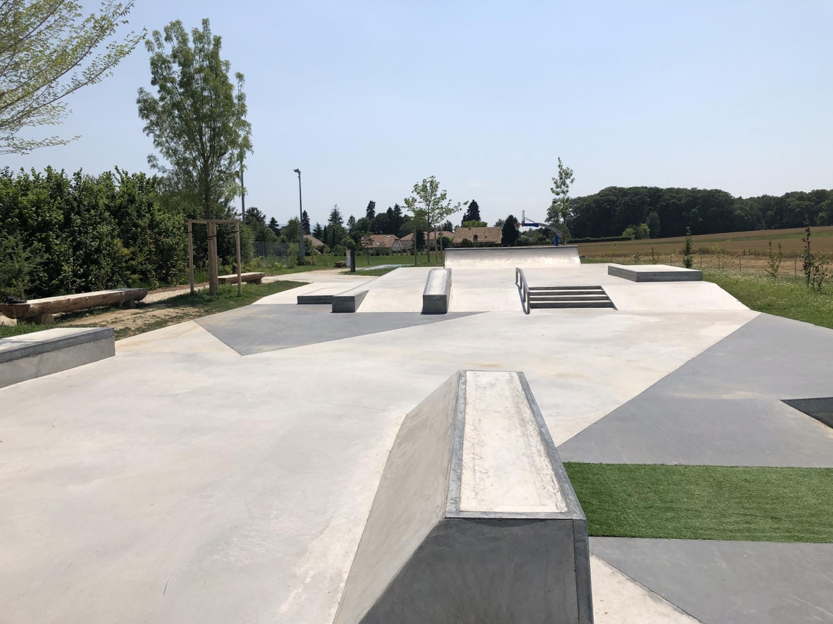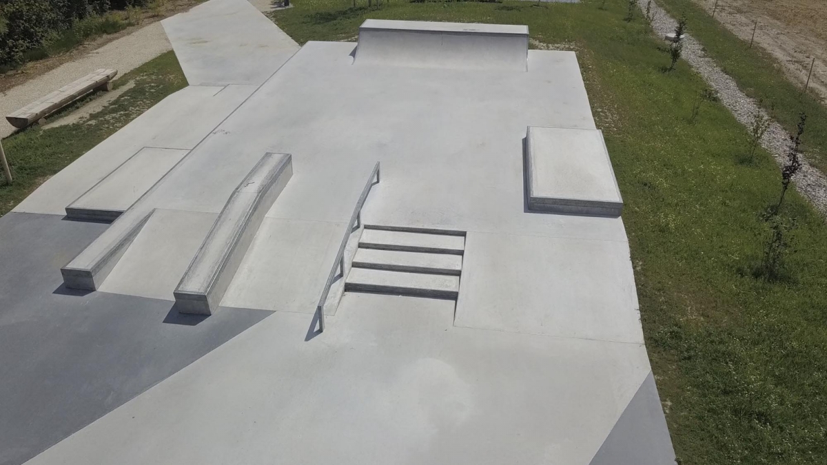 Auf der Plattform stehen eine Treppe mit Handrail und Hubba, sowie ein Manual Pad mit London Gap zur Verfügung. Auf der anderen Seite befinden sich eine 6 m breite Minirampe und eine Bank mit Wall Ride. Dazwischen stehen eine Pyramide, Curbs, ein Rail und ein A-Frame mit Gap. Die Elemente sind so angeordnet, dass fliessende Lines möglich sind und die Nutzung durch geübte Fahrer sowie Anfänger bestehen.
