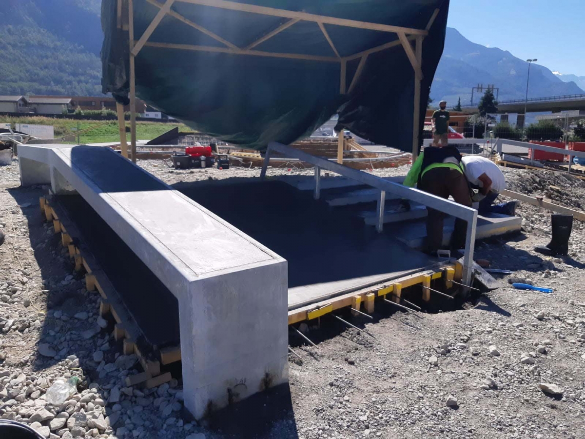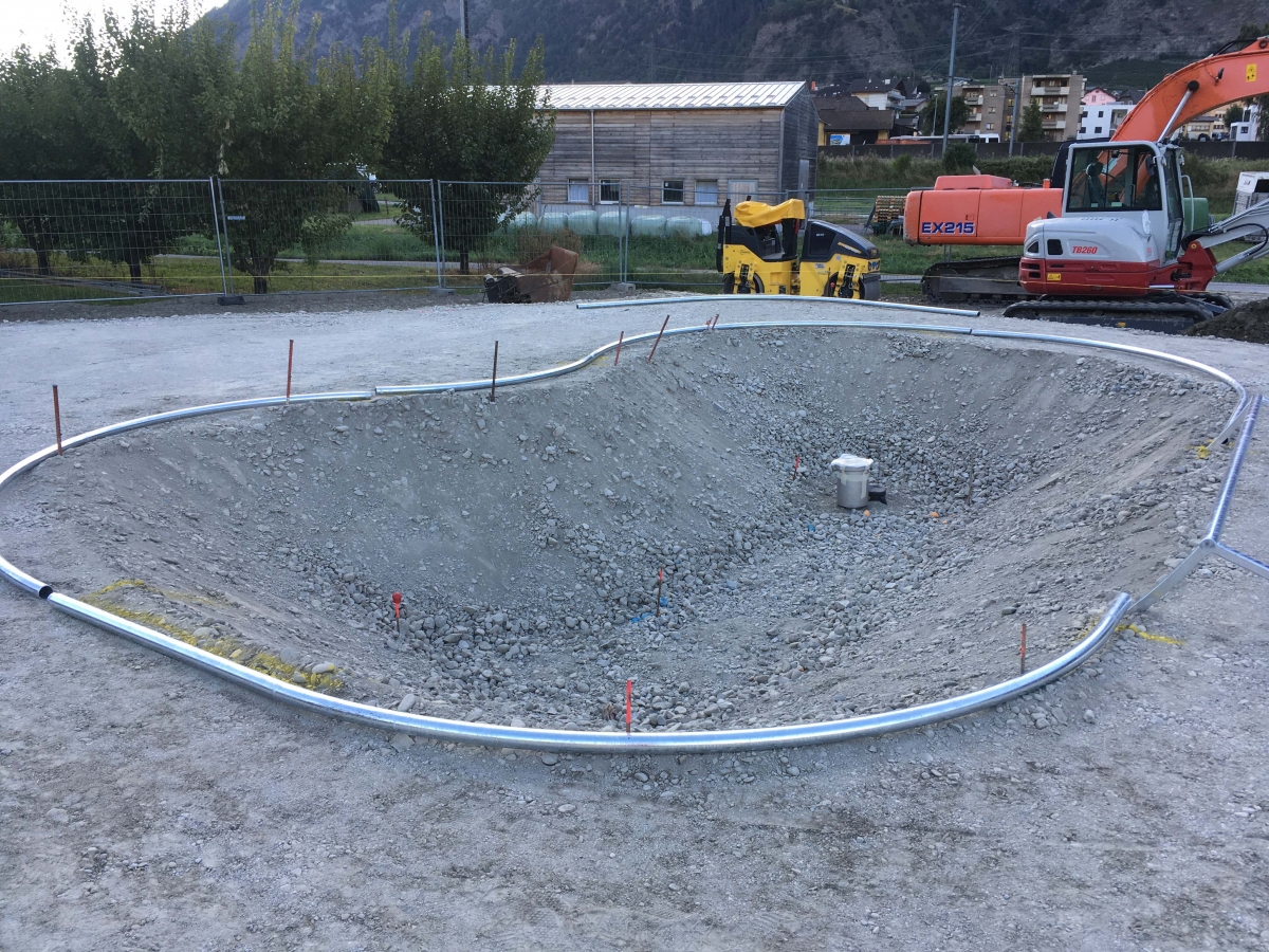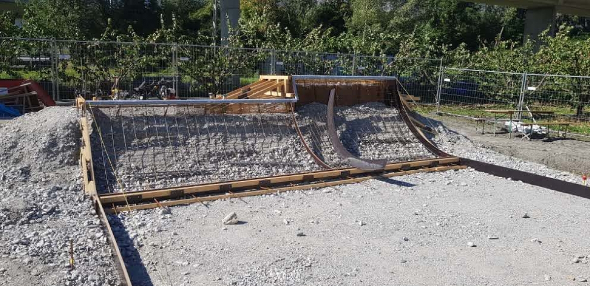 Die Baubewilligung wurde nach 5 Monaten erteilt und die Arbeiten konnten im August 2020 beginnen. Zuerst wurde das Terrain durch einen Lokalunternehmer vorbereitet, der den Aushub und den Aufbau der Frostfreischicht ausführte. Nachdem die Tragfähigkeit der kompaktierten Kiesschichten durch die Bauleitung kontrolliert wurden, erfolgte die Übergabe der Arbeiten an die Vertical Beton Crew. Am 24. August starteten die Skatepark Bauarbeiten.