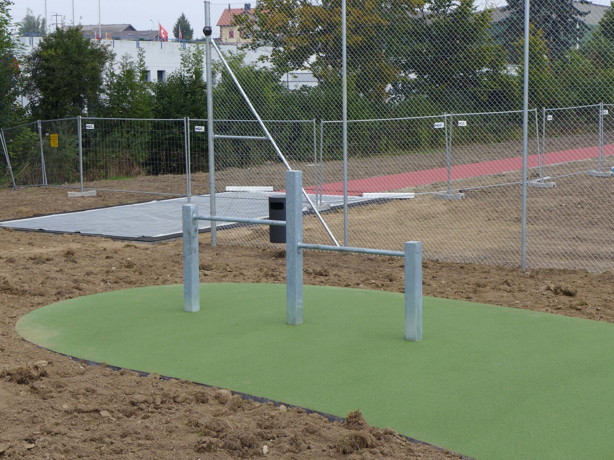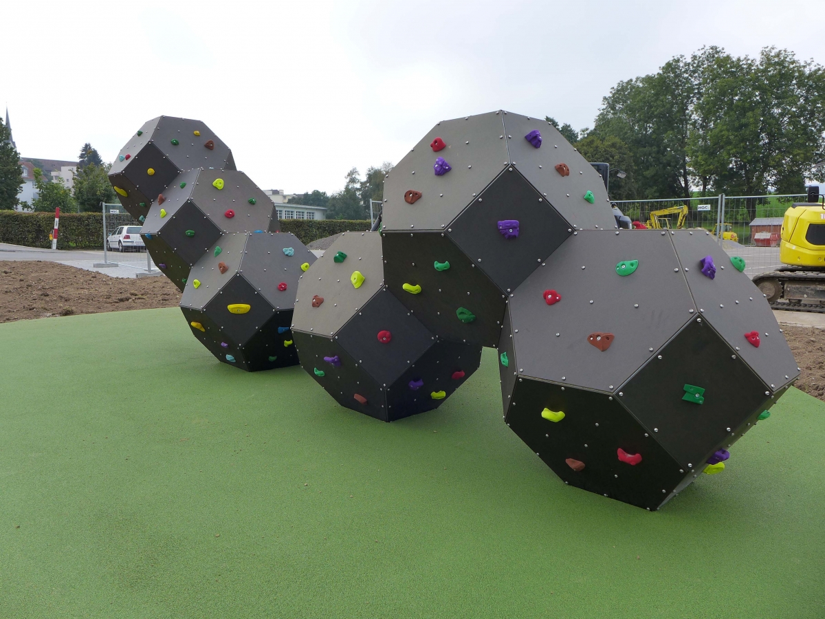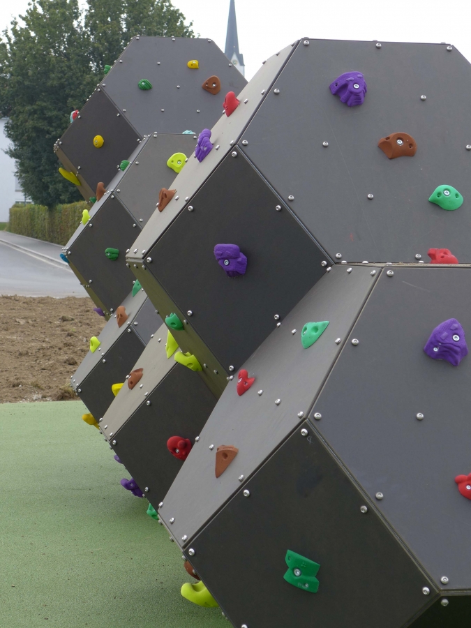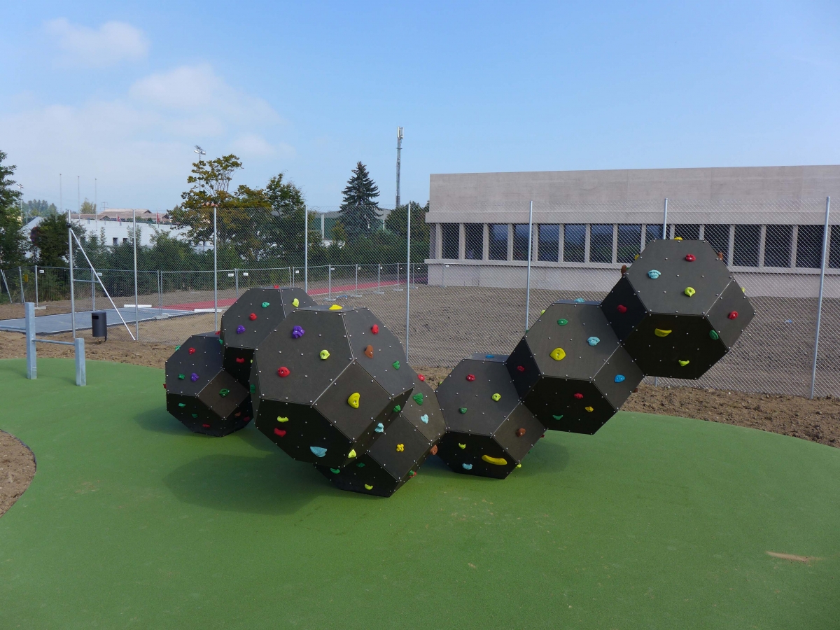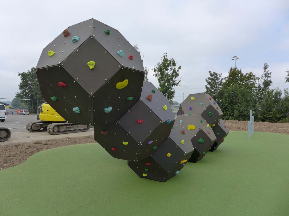 Die Kletter-Raupe besteht aus 8 Elementen, welche in verschiedene Himmelsrichtungen weisen. Dadurch entstand ein Kletterobjekt welches die Verbindung zwischen Spiel und Boulder- Sport macht. Die Doppel Kinderreckstange wurde auf Kundenwunsch mit einem hohen Mittelpfosten ausgeführt. Beide Anlagen werden durch einen EPDM Fallschutz ergänzt. Die Kletter-Raupe wurde in den Produktionshallen der Vertical Technik AG vormontiert und am Stück angeliefert. Die Montage erfolgte per LKW-Kran auf die bauseitig vorbereiteten Beton Fundamente und war nach drei Stunden abgeschlossen.