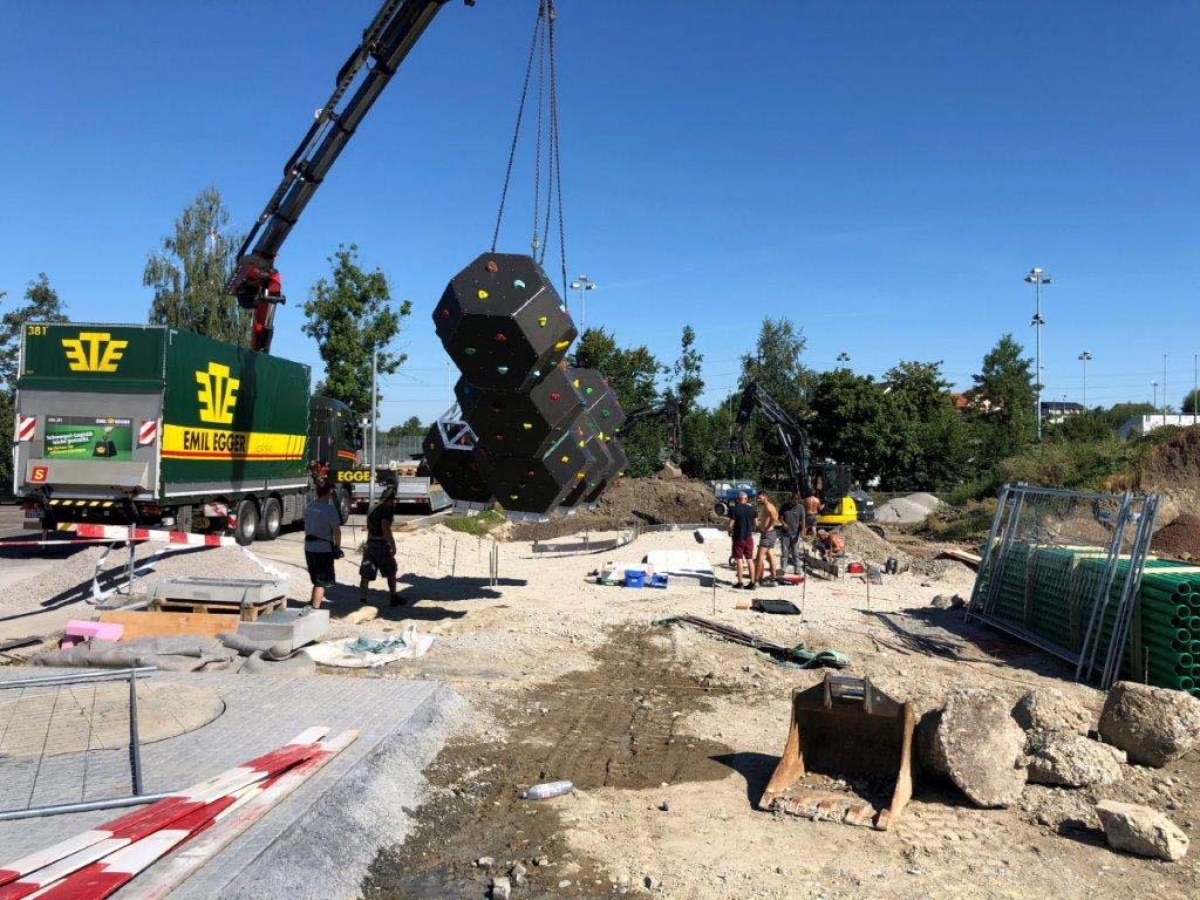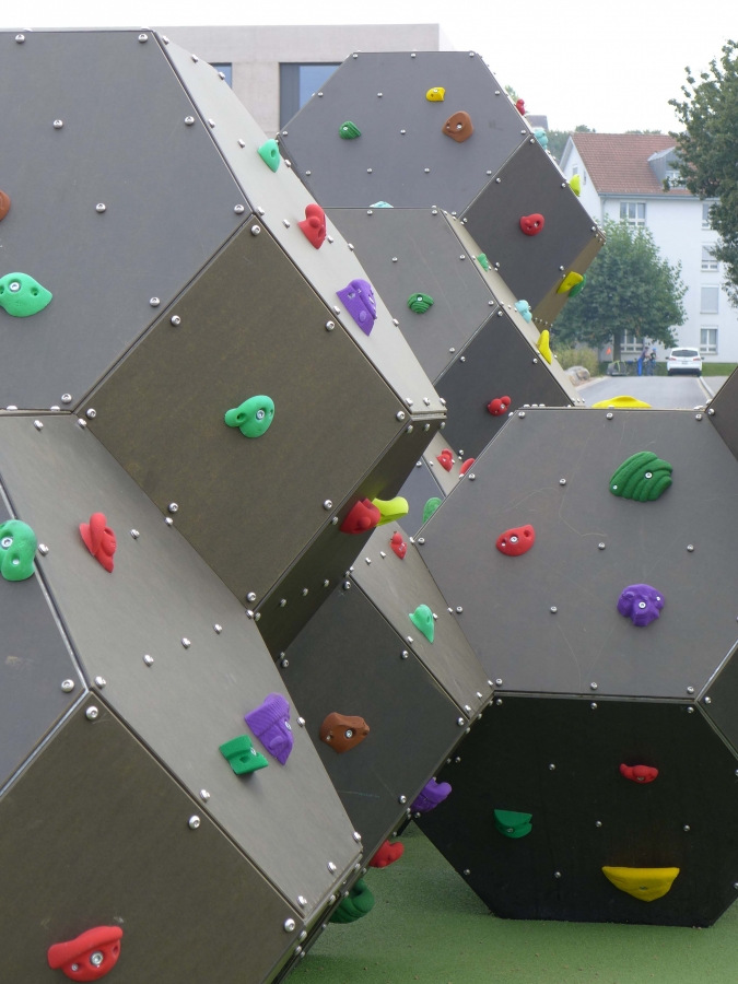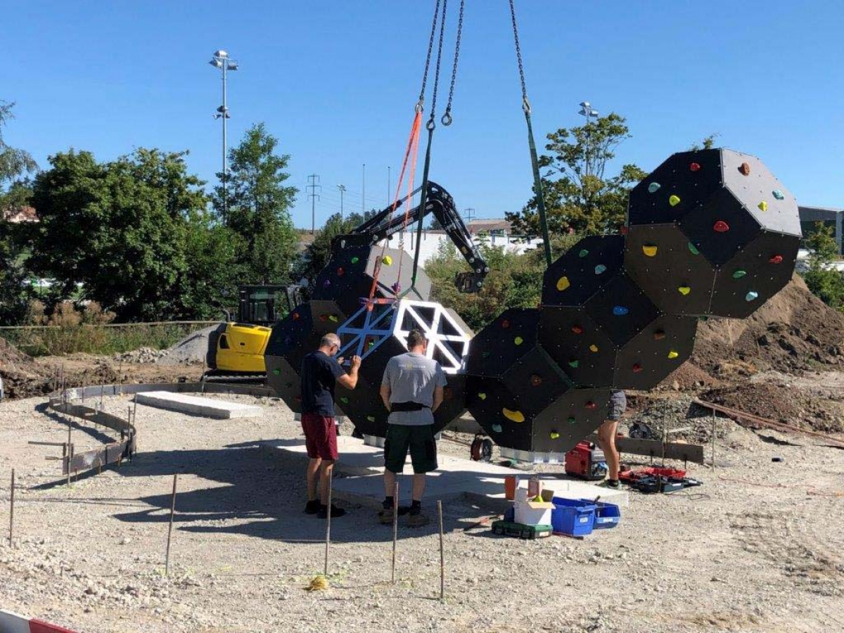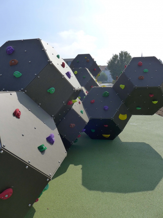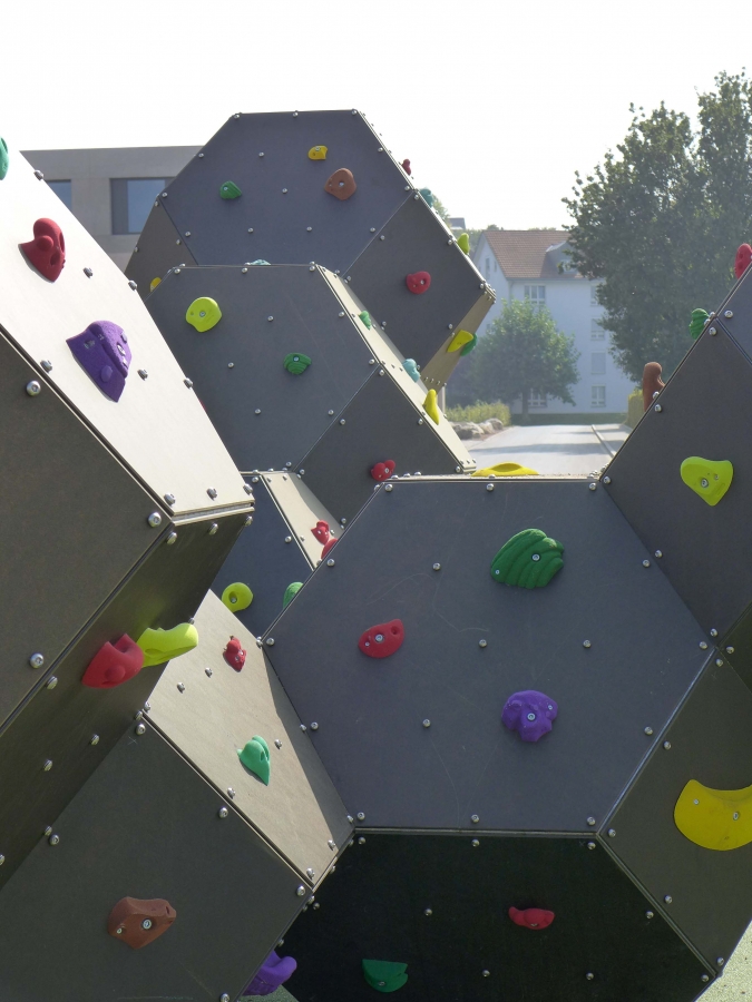 Die Kletter-Raupe besteht aus 8 Elementen, welche in verschiedene Himmelsrichtungen weisen. Dadurch entstand ein Kletterobjekt welches die Verbindung zwischen Spiel und Boulder- Sport macht. Die Doppel Kinderreckstange wurde auf Kundenwunsch mit einem hohen Mittelpfosten ausgeführt. Beide Anlagen werden durch einen EPDM Fallschutz ergänzt. Die Kletter-Raupe wurde in den Produktionshallen der Vertical Technik AG vormontiert und am Stück angeliefert. Die Montage erfolgte per LKW-Kran auf die bauseitig vorbereiteten Beton Fundamente und war nach drei Stunden abgeschlossen.