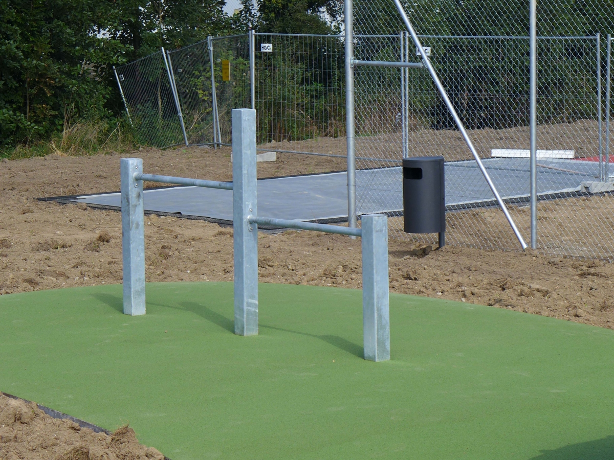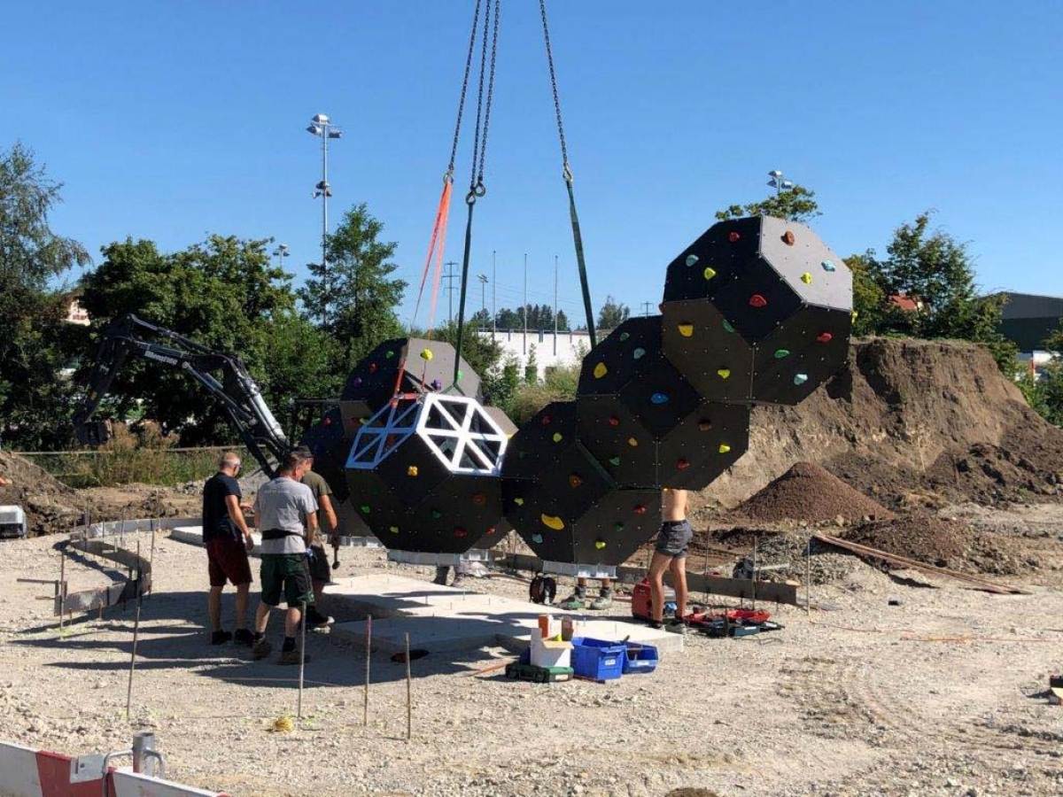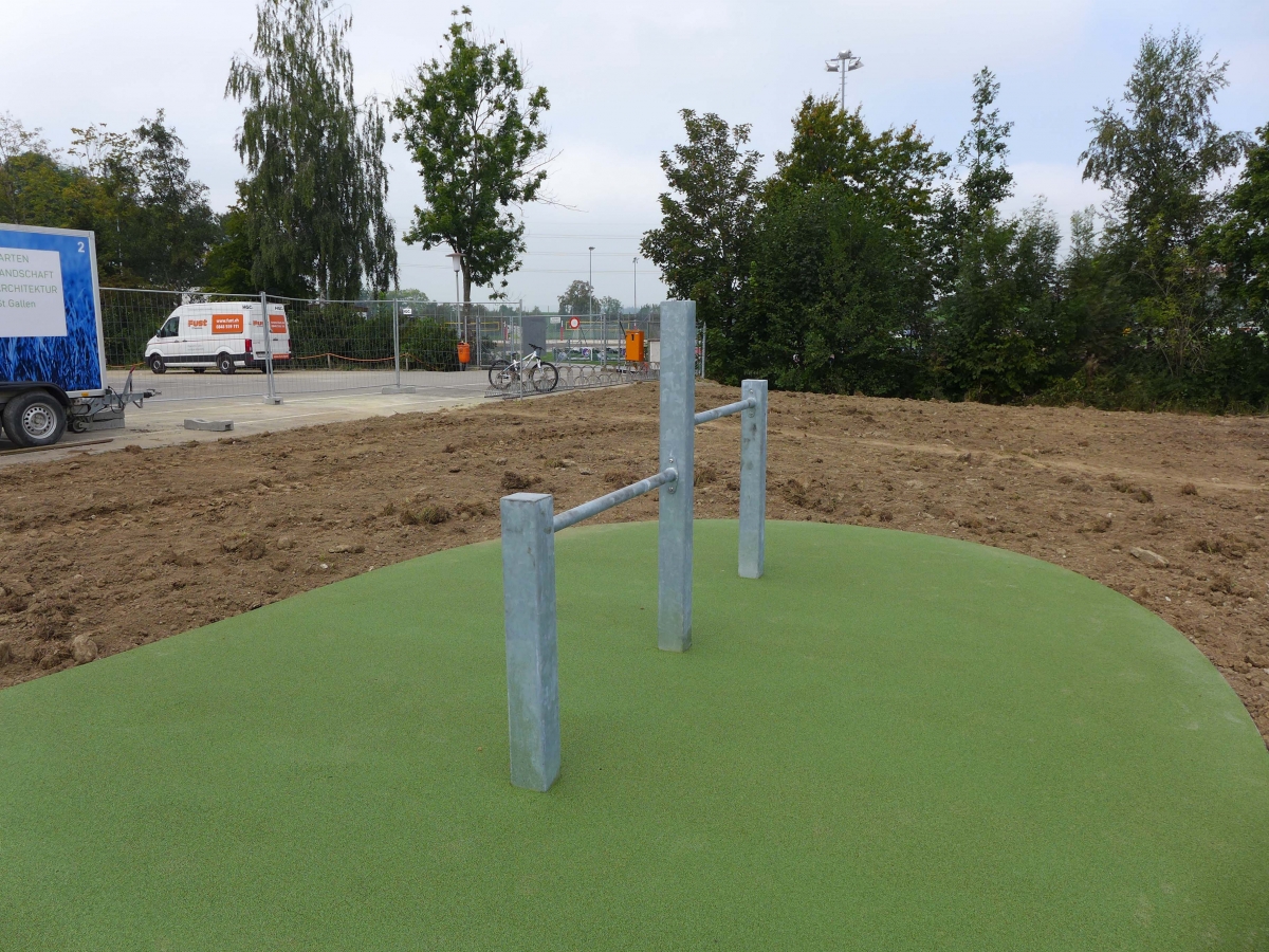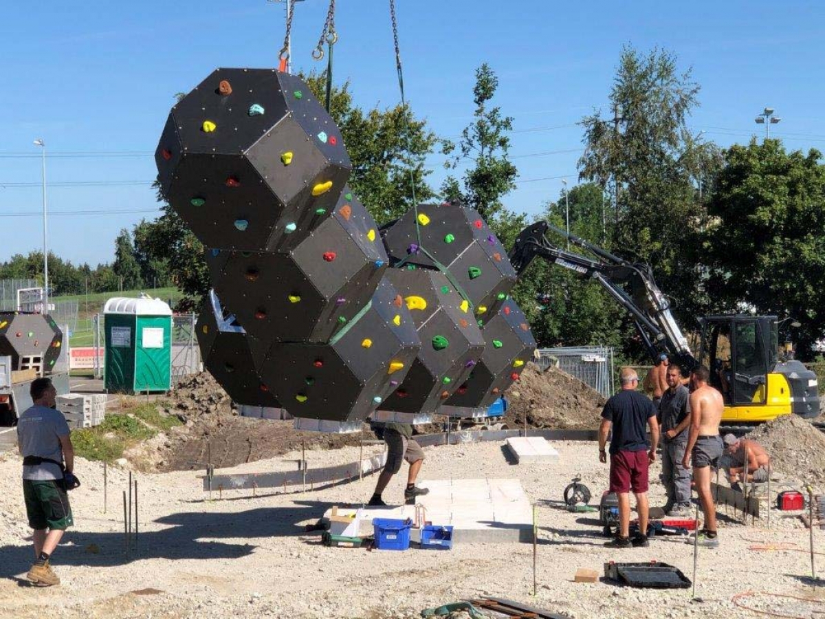 Die Kletter-Raupe besteht aus 8 Elementen, welche in verschiedene Himmelsrichtungen weisen. Dadurch entstand ein Kletterobjekt welches die Verbindung zwischen Spiel und Boulder- Sport macht. Die Doppel Kinderreckstange wurde auf Kundenwunsch mit einem hohen Mittelpfosten ausgeführt. Beide Anlagen werden durch einen EPDM Fallschutz ergänzt. Die Kletter-Raupe wurde in den Produktionshallen der Vertical Technik AG vormontiert und am Stück angeliefert. Die Montage erfolgte per LKW-Kran auf die bauseitig vorbereiteten Beton Fundamente und war nach drei Stunden abgeschlossen.