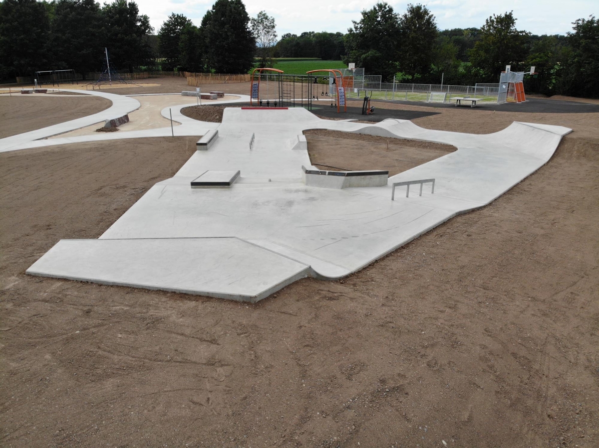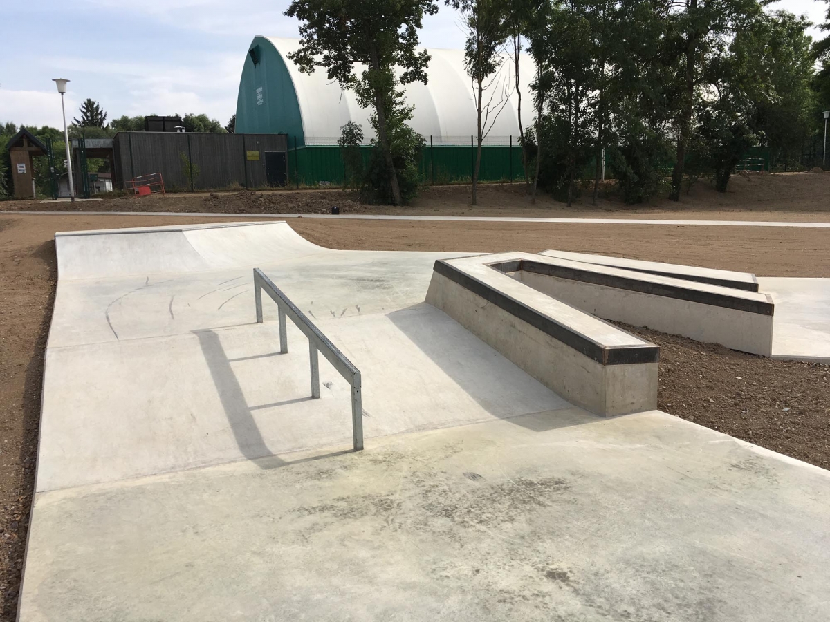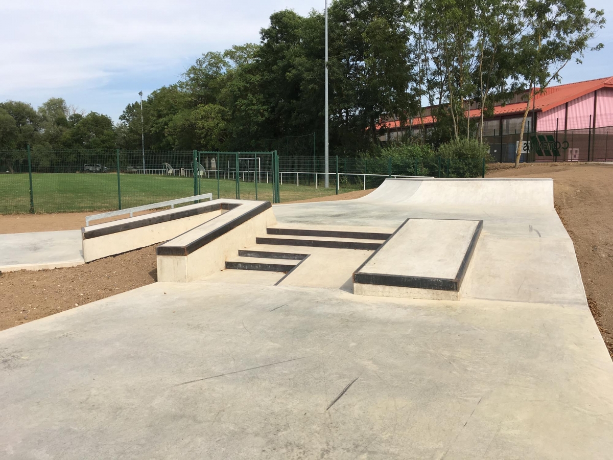 Der Skatepark besteht aus einem Grünkern mit Pflanzen und Betonflächen auf unterschiedlichen Niveaus welche ringsum verlaufen. Als Anlaufelemente dienen eine Hip-Quarterpipe und eine Hip-Bank mit Parking-Block. Dazwischen befinden sich Curbs, ein Rail, ein Speed-Bump mit Rainbow-Rail und zwei Stair Sets mit Hubba. Der angrenzende Spielplatz umfasst viele Elemente für Kinder und einen Sportbereich.