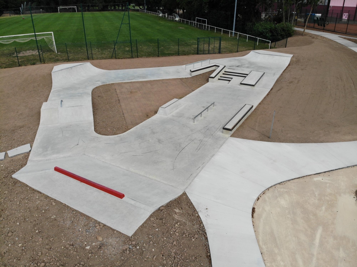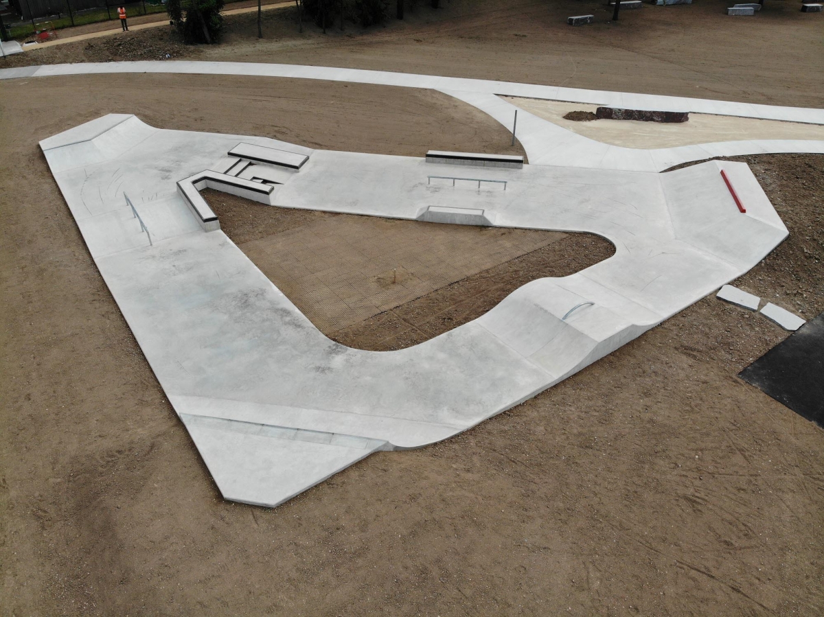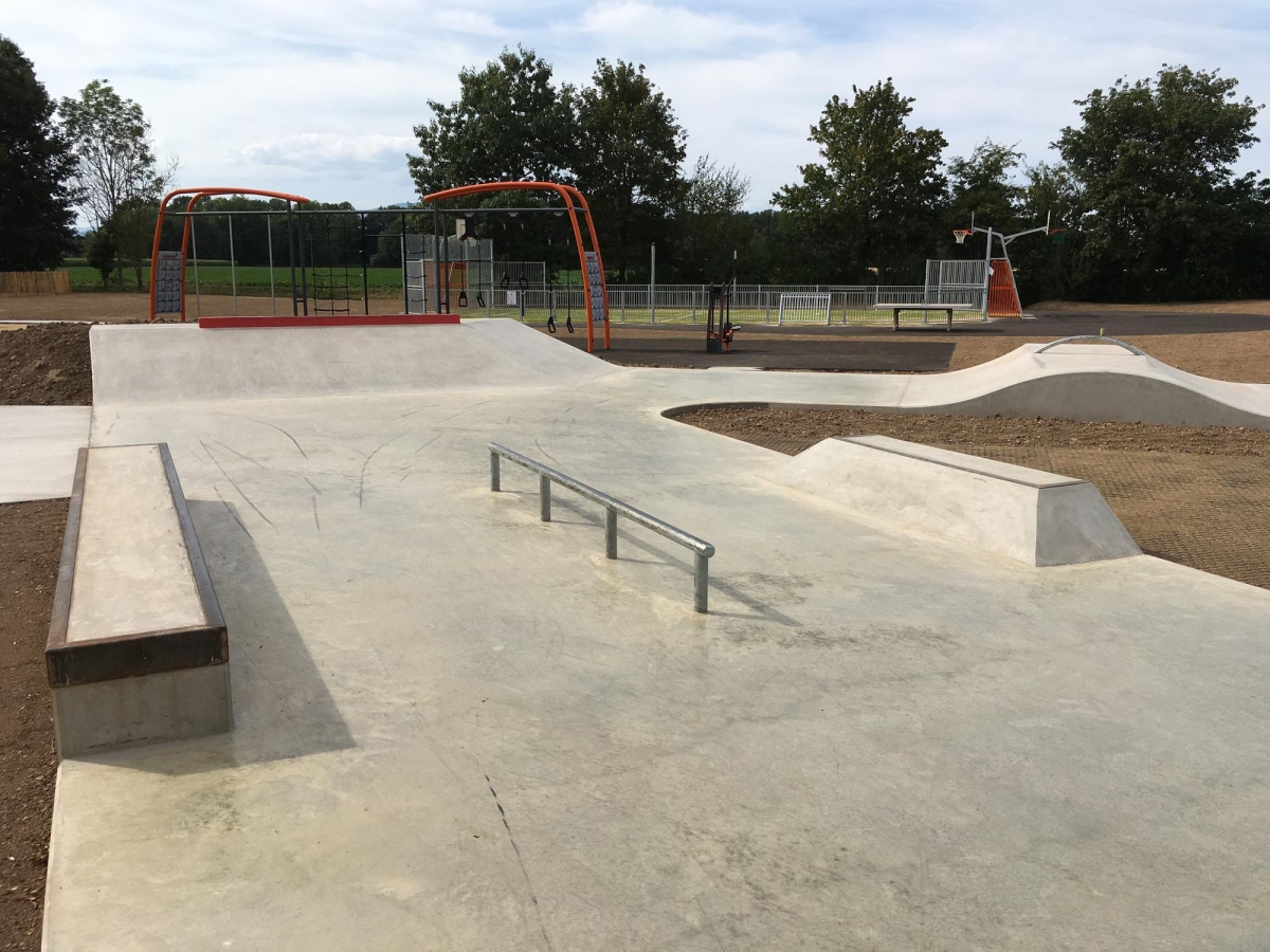Der Skatepark besteht aus einem Grünkern mit Pflanzen und Betonflächen auf unterschiedlichen Niveaus welche ringsum verlaufen. Als Anlaufelemente dienen eine Hip-Quarterpipe und eine Hip-Bank mit Parking-Block. Dazwischen befinden sich Curbs, ein Rail, ein Speed-Bump mit Rainbow-Rail und zwei Stair Sets mit Hubba. Der angrenzende Spielplatz umfasst viele Elemente für Kinder und einen Sportbereich.