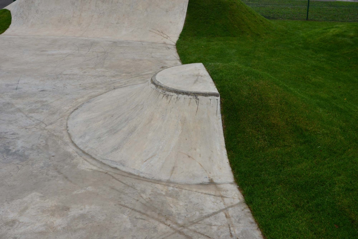 Als Anlaufelemente dienen eine Corner-Quarterpipe und ein Rollin. Dazwischen befinden sich ein Curb, ein Volcano, ein Spine mit eine Hip-Quarterpipe und eine Pyramide mit Parking-Block. Das Special Feature im Park ist ein Wallride mit Lochblech. Die Gemeinde hat die Landschaftsarbeiten selbst realisiert.
