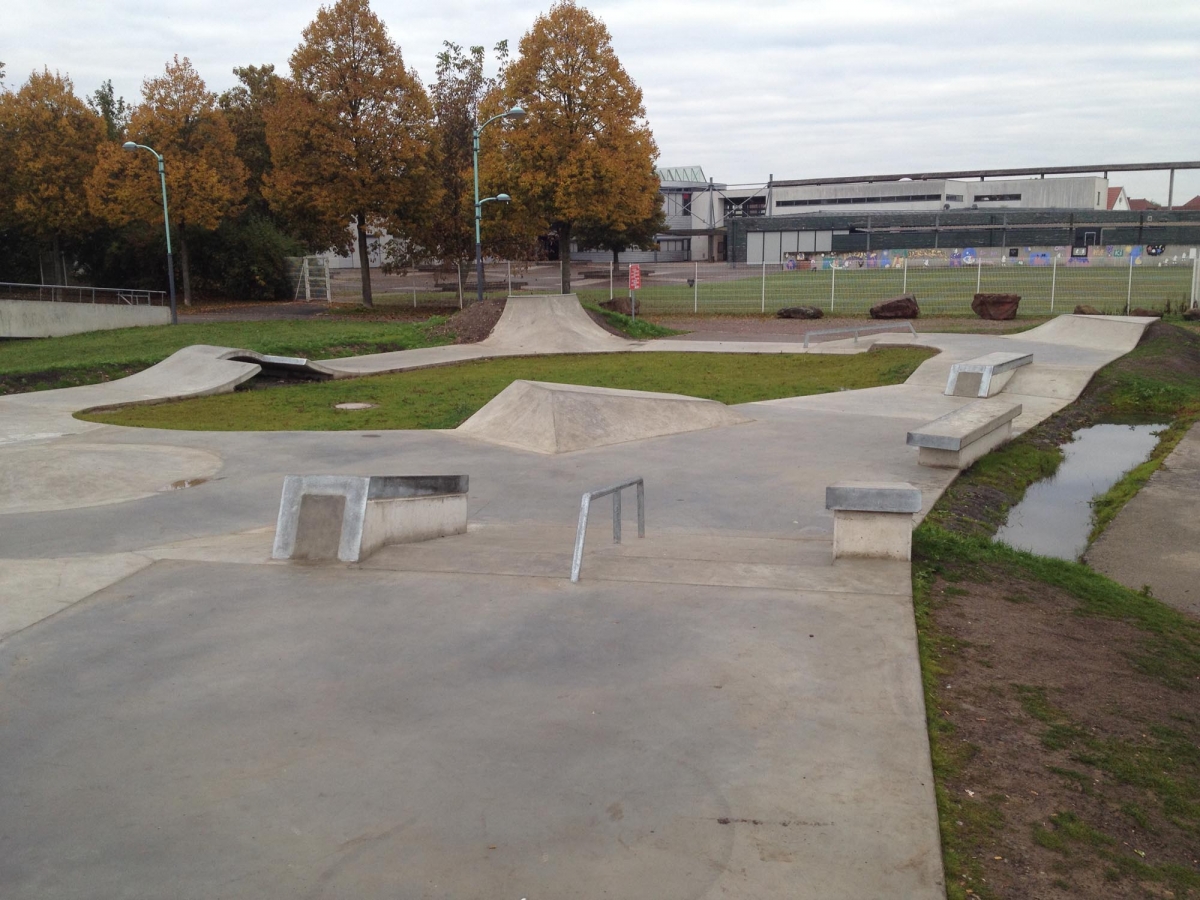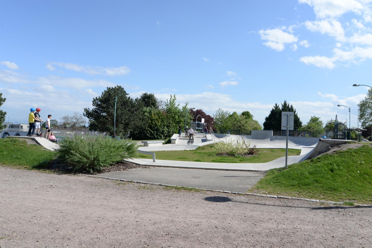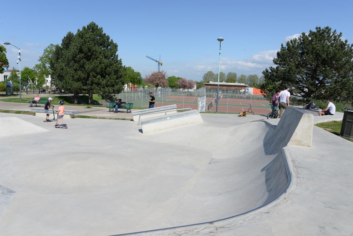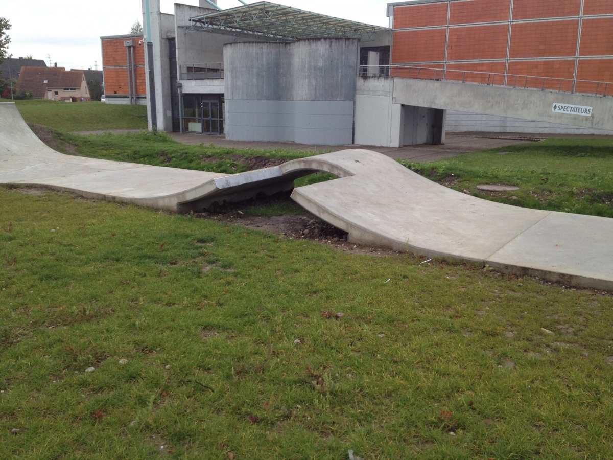 So entstand ein 290 m² grosser Skatepark, der aus einer Street Zone und einem Flow Park zusammengesetzt ist. Die Street Zone ist zwischen zwei Plattformen angeordnet. Sie ist ausgestattet mit einem Handlauf, zwei Hubbas, einem London Gap, einer kleinen Mauer, einem Manual Pad und einer flachen rechteckigen Rail. Beide Plattformen sind durch eine Bordsteinkante und eine Pyramide getrennt. Die grosse Plattform ist durch eine große Hip Quarterpipe verbunden welche eine Verlängerung präsentiert. Gegenüber steht ein China-Gap neben einer Speed Bump, daneben eine andere Hip im Flow Park. Die Anordnung dieser Elemente schafft eine sehr schnelle Strecke rund um den Skatepark. In der Mitte und in der Peripherie des Skateparks wurde der Asphalt durch Rasen ersetzt. Zwei Vertiefungen auf beiden Seiten des Feldes erlauben eine natürliche Versickerung von Regenwasser und verhindern gleichzeitig die Zufahrt von Kraftfahrzeugen auf den Skatepark.