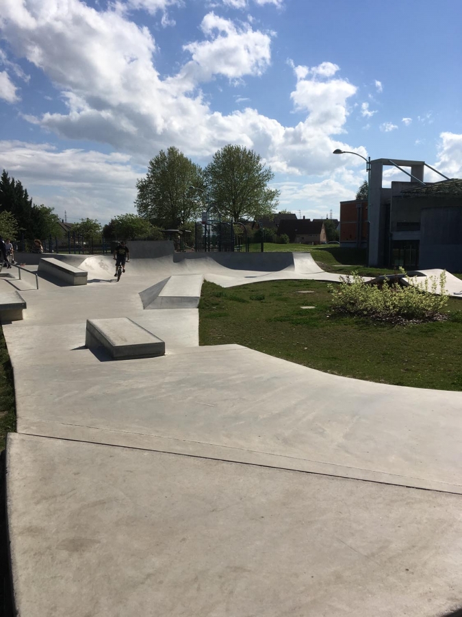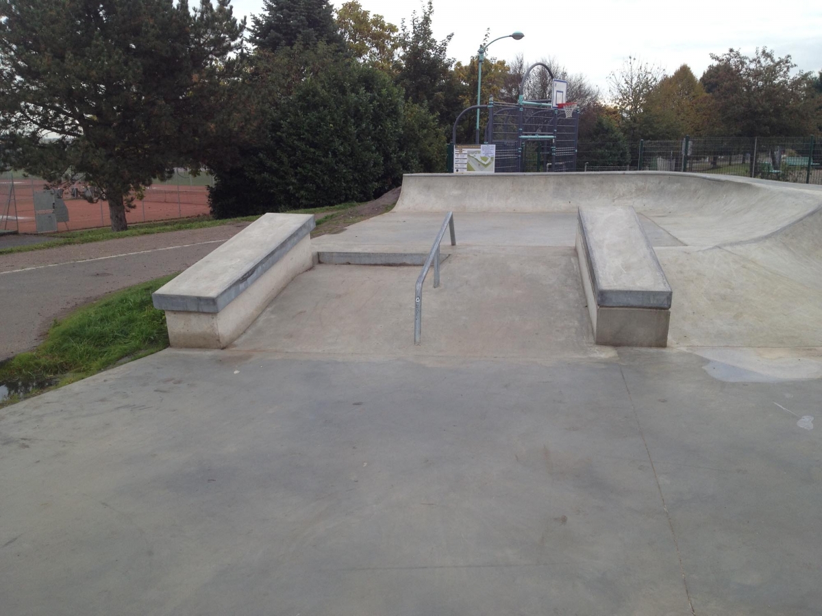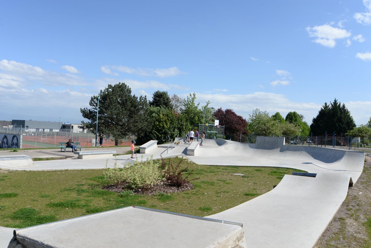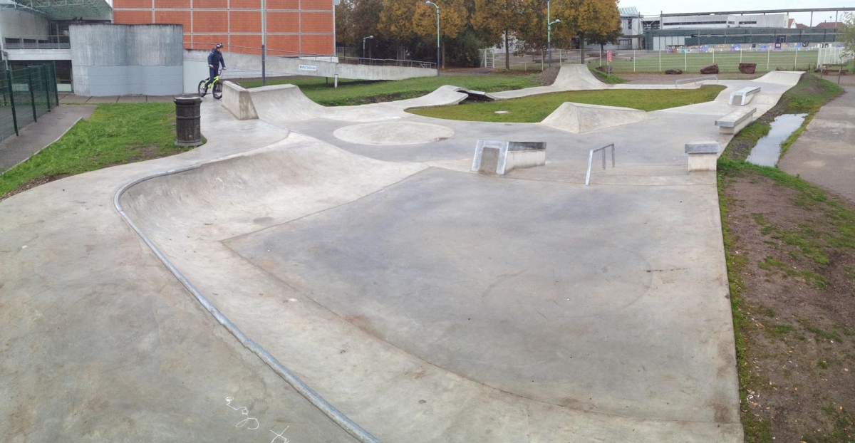 So entstand ein 290 m² grosser Skatepark, der aus einer Street Zone und einem Flow Park zusammengesetzt ist. Die Street Zone ist zwischen zwei Plattformen angeordnet. Sie ist ausgestattet mit einem Handlauf, zwei Hubbas, einem London Gap, einer kleinen Mauer, einem Manual Pad und einer flachen rechteckigen Rail. Beide Plattformen sind durch eine Bordsteinkante und eine Pyramide getrennt. Die grosse Plattform ist durch eine große Hip Quarterpipe verbunden welche eine Verlängerung präsentiert. Gegenüber steht ein China-Gap neben einer Speed Bump, daneben eine andere Hip im Flow Park. Die Anordnung dieser Elemente schafft eine sehr schnelle Strecke rund um den Skatepark. In der Mitte und in der Peripherie des Skateparks wurde der Asphalt durch Rasen ersetzt. Zwei Vertiefungen auf beiden Seiten des Feldes erlauben eine natürliche Versickerung von Regenwasser und verhindern gleichzeitig die Zufahrt von Kraftfahrzeugen auf den Skatepark.