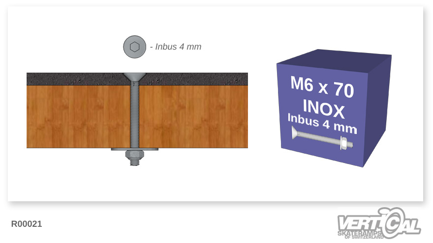 Vis à tête fraisée M6 x 70 INOX avec contre-écrou galvanisé et grande rondelle (30 x 6,5 x 2 mm), 45 pièces par plaque Skateface®