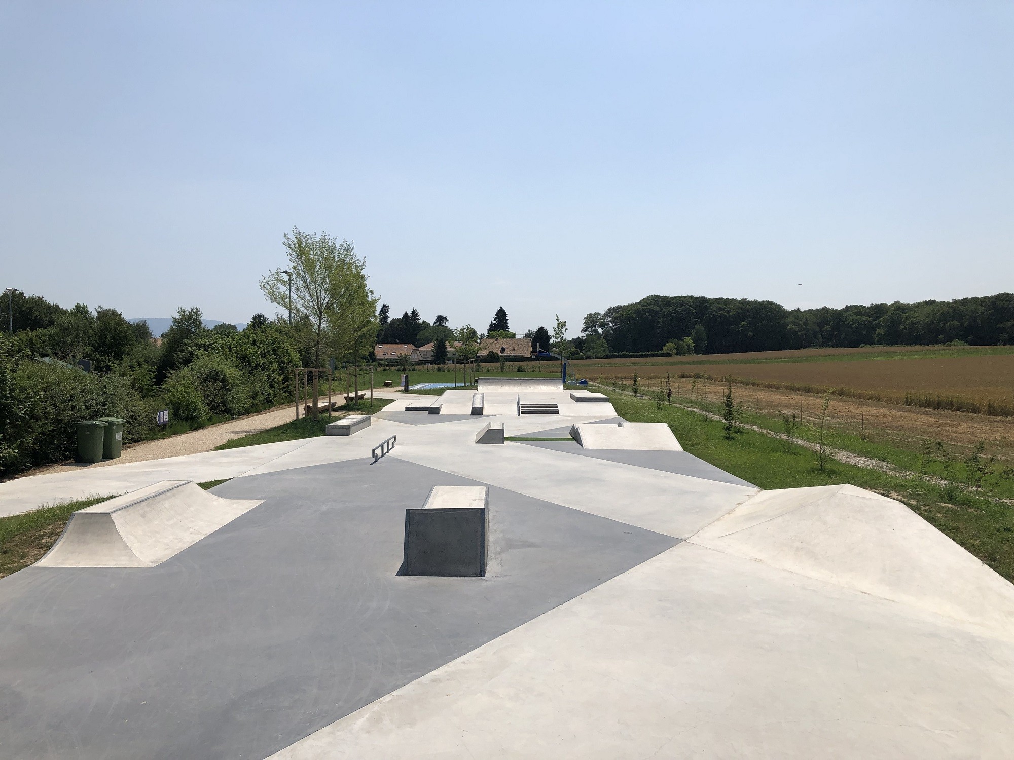 L’aspetto geometrico dello skate park è accentuato dal cemento nero nelle diagonali. Poiché la sede della FIBA si trova a Mies, accanto allo skate park è stato costruito anche un nuovo campo da basket “3×3”. Il progetto comprende anche un nuovo parcheggio, aree verdi e una fontana.