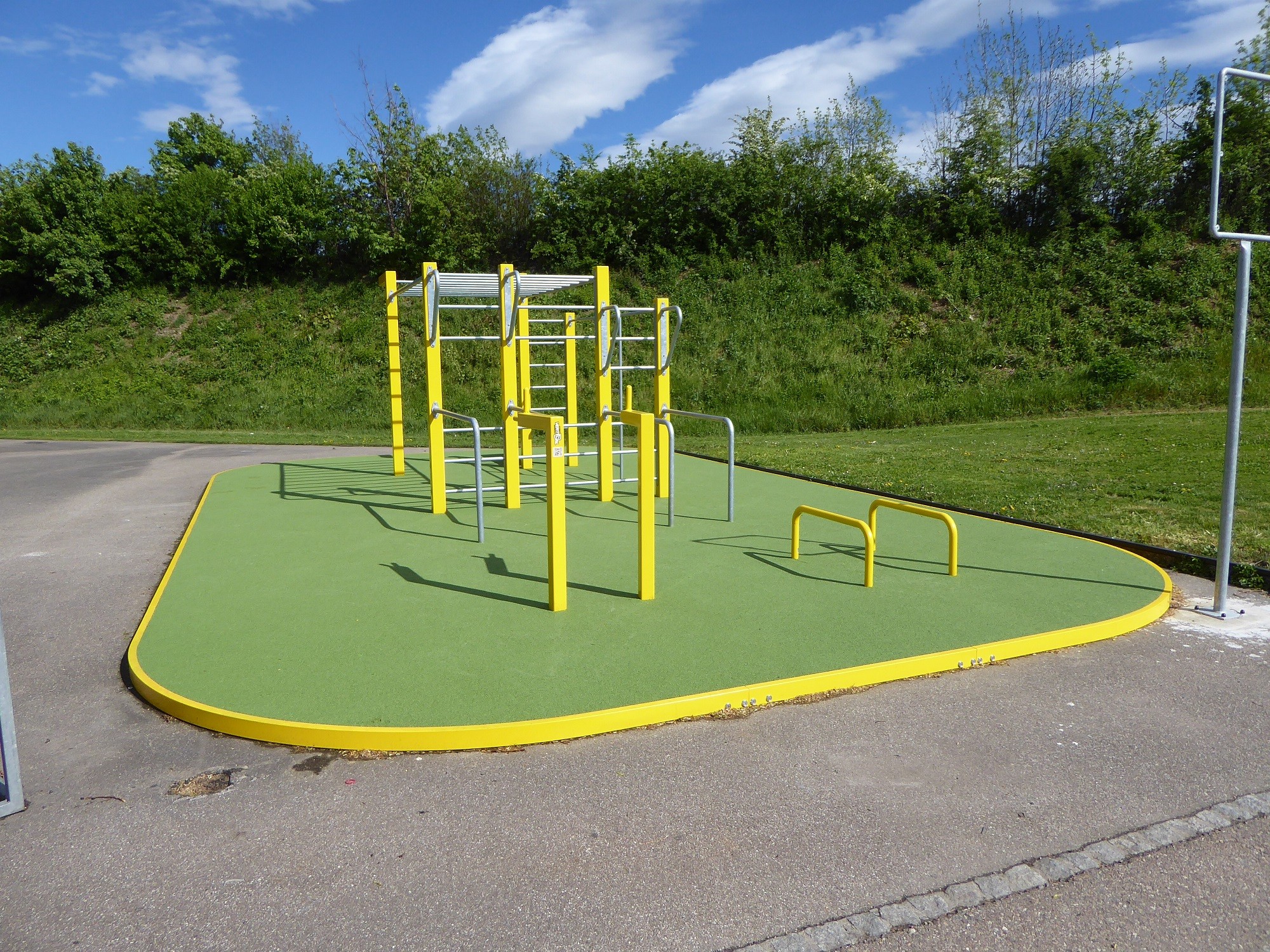 Accanto allo skate park di Pratteln è stata recentemente installata una struttura per l’allenamento in strada. La posizione accanto alla piscina di Pratteln e al centro sportivo di Sandgruben si adatta perfettamente al concetto di sport del comune. La struttura per l’allenamento in strada comprende vari elementi come un sollevatore di gambe, un modulo per le flessioni, un’asta per le bandiere, ecc. ed è aperta al pubblico. Il parcheggio per le auto è disponibile accanto alla struttura. Il pavimento è coperto da una superficie anticaduta in EPDM, che può essere utilizzata anche per gli esercizi a terra.