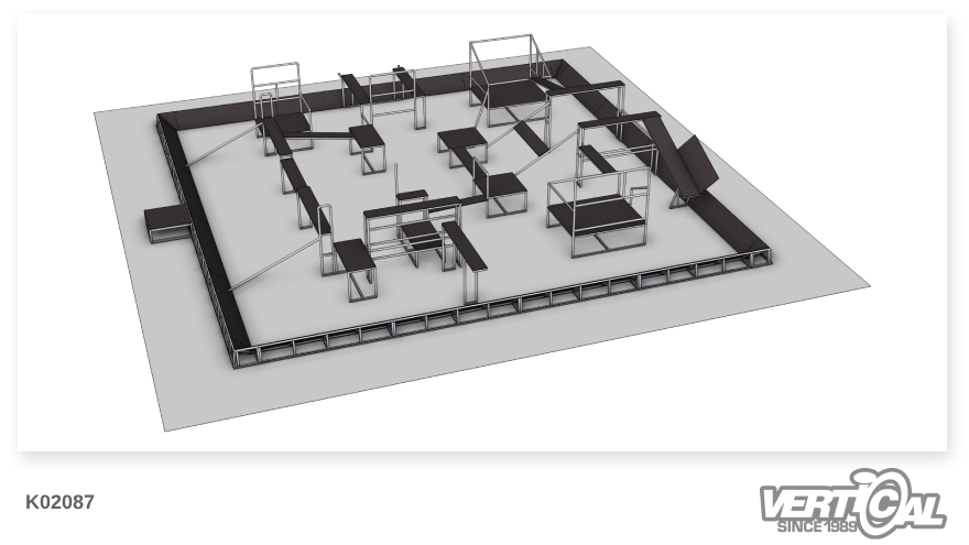 Die Grundkonstruktion der Module besteht aus verzinkten Stahlrohren und Rohrverbindern, die Umrandung aus verzinkten und verschweissten Stahlrohren. Beidseitig Phenolharz- beschichtetes Sperrholz, Oberseite mit Siebdruck Struktur, Kanten gefast und gemalt.